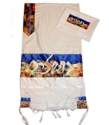 This tallit is part of their newest line at Gabrieli Tallit, this beautiful hand-made tallit from their studio in Israel, made with Warp knitting technology of the highest quality. Featuring a silk printed city of Jerusalem with a blue sky above it.