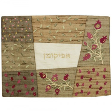 This gorgeous Raw Silk Afikomen Bag set will add a touch of color and distinction to your Passover table! Here we have a beautifully intricate pomegranate design, along with the word Afikomen on the bag in Hebrew letters. Designs in raw silk are appliquéd and attached with embroidery. This will be a treasured centerpiece in anyone's Passover home!
